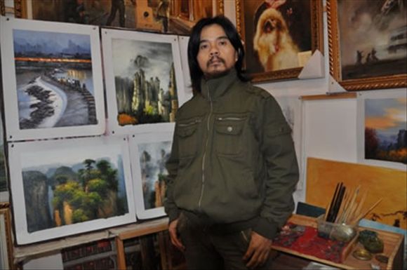 熊风最擅长的是油画,也擅长雕刻等等。我不太懂画,在熊风的画室却被其琳琅满目的画作所迷惑,这些用油作的画富有浓厚的立体感,家乡张家界的山的奇特,水的柔情,父老乡亲质朴的音容笑貌在这里都得到了逼真的展示。