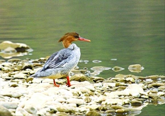 1月10日,鸟类保护志愿者在澧水张家界永定区段发现3只中华秋沙鸭。中华秋沙鸭是第三纪冰川期后残存下来的物种,被称为鸟类中的活化石,属国家一级保护动物,是与大熊猫齐名的国宝。这是该物种今年首次在湖南被发现。左图为一只在岸边休憩的雌性中华秋沙鸭。