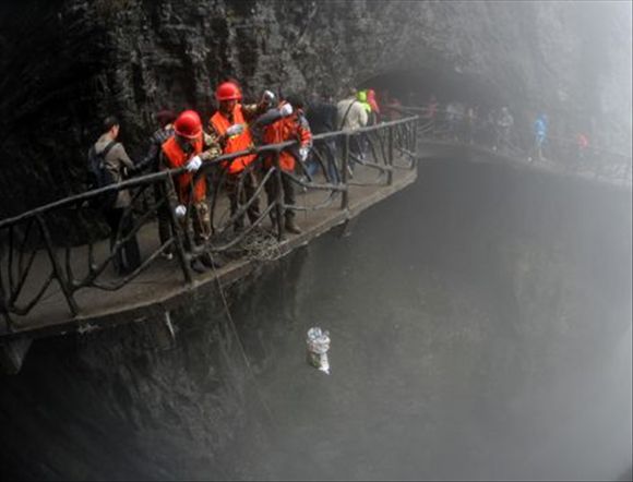 4月4日,在湖南省张家界天门山景区鬼谷天堑峡谷处,众多游客围观清洁工人清理垃圾。